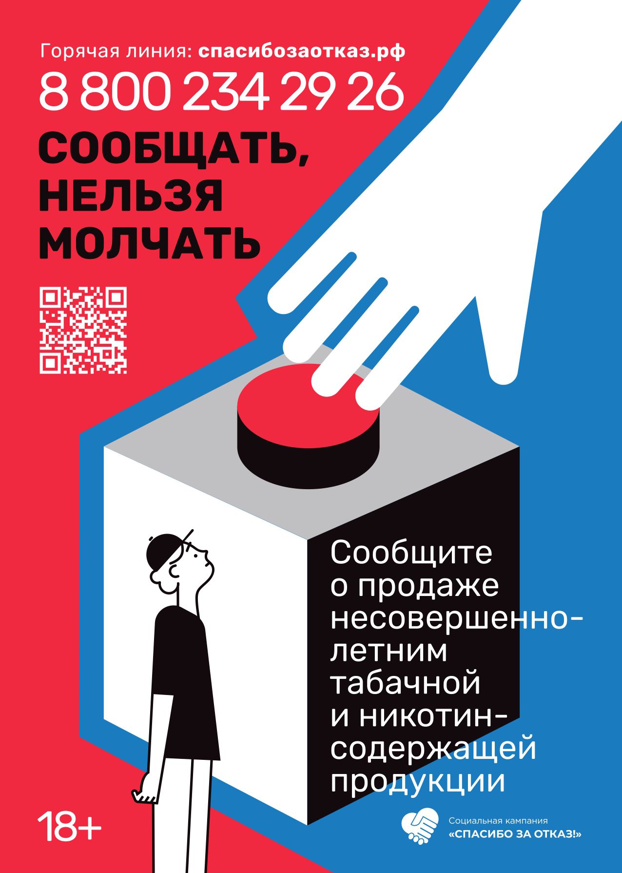 | В Ленинградской области работает «горячая линия» для приема сообщений от жителей о местах продажи сигарет и вейпов подросткам. Если Вы стали свидетелем правонарушения звоните по телефону: 8-800-234-29-26 или пишите через сайт спасибозаотказ.рф Не оставайтесь в стороне – сообщайте о нарушениях! «Горячая линия» создана в рамках социальной кампании по борьбе с продажей табачной и никотинсодержащей продукции несовершеннолетним «СПАСИБО ЗА ОТКАЗ!» Общественным Советом по проблеме подросткового курения при поддержке Правительства Ленинградской области. |  |